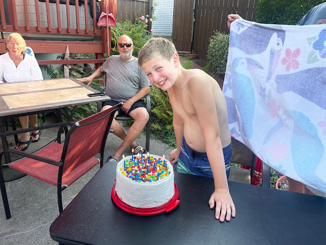 Pool parties x2. We squeezed Grant's family party in on his actual birthday mid-week. It was a smaller gathering, as Great Grandma had her hip surgery that day, and Blake and Lindsay weren't able to make it. It was a hot day--perfect to be at the pool.