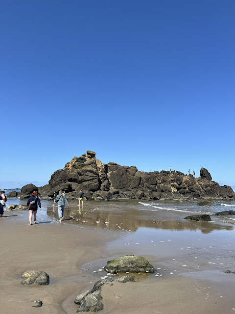 The next day we went south and stopped at Beverly Beach, as that was one of Miles' requests. It was misty and cloudy, and some of us just sat on a blanket and chatted, while others explored. They found a baby seal carcass and gave it a burial. Some worked on some beach art. Next stop was Newport. We ate our picnic lunch at tables next to a brewery that wasn't open yet and then walked down to downtown Newport. We visited the sea lions by the pier and some people made a stop for boba tea. That evening we had a sit down dinner of lasagna, salad, and bread at the huge, long table at the house (really a couple tables pushed together). We all fit, just barely. That night about half our group went back to the beach for a fire and others stayed back to do an escape room game. Hudson surprised us and showed up for the last night, which was fun. We didn't think he'd be able to make it at all.